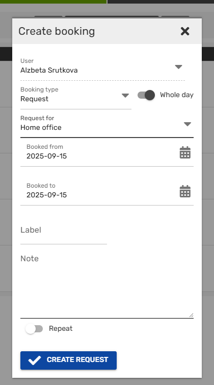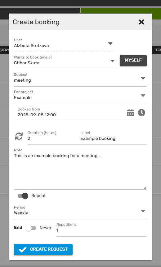 The booking module currently contains two calendars: one for tracking the time spent on a project and the other for tracking the presence of group members at the workplace. Both of these calendars share the same functional base and allow users to create "bookings" either for the whole day or for a specific time and duration. There are various possibilities to repeat the event (daily, weekly, quarterly, etc.). The calendar can easily be connected to a Slack/Discord channel and the notifications about the upcoming events can be shared there.