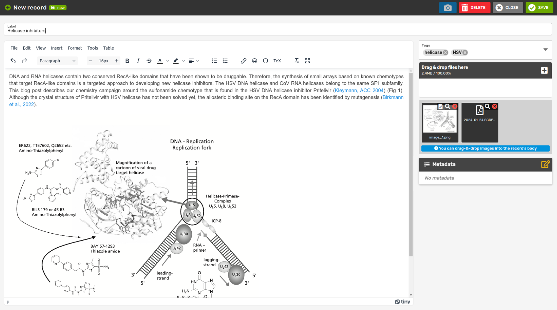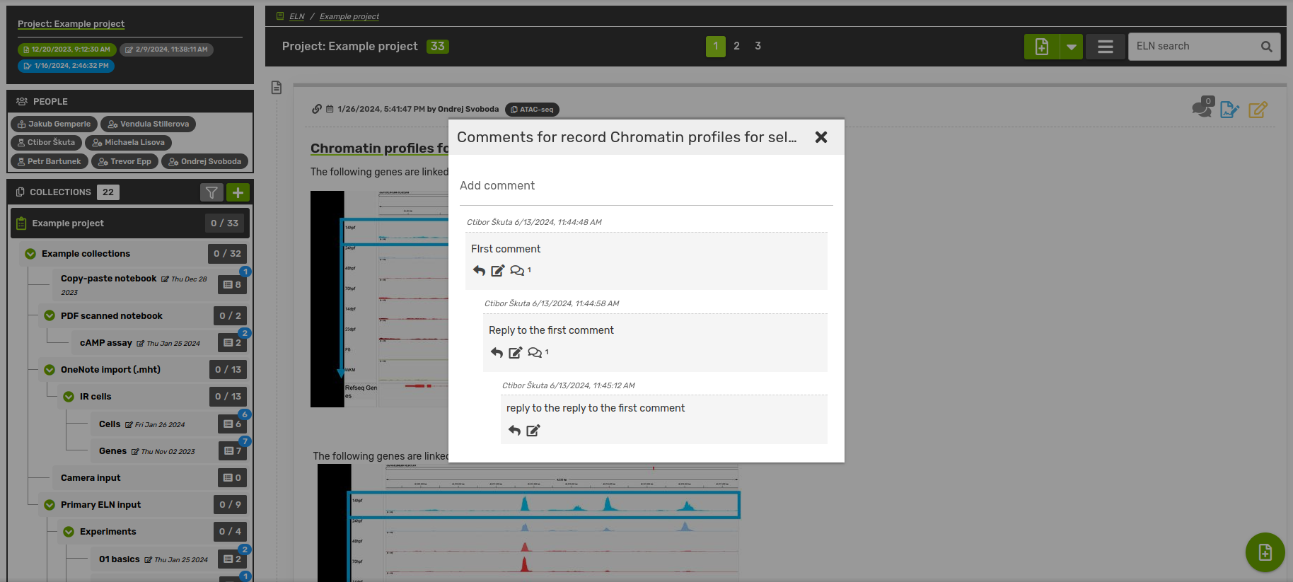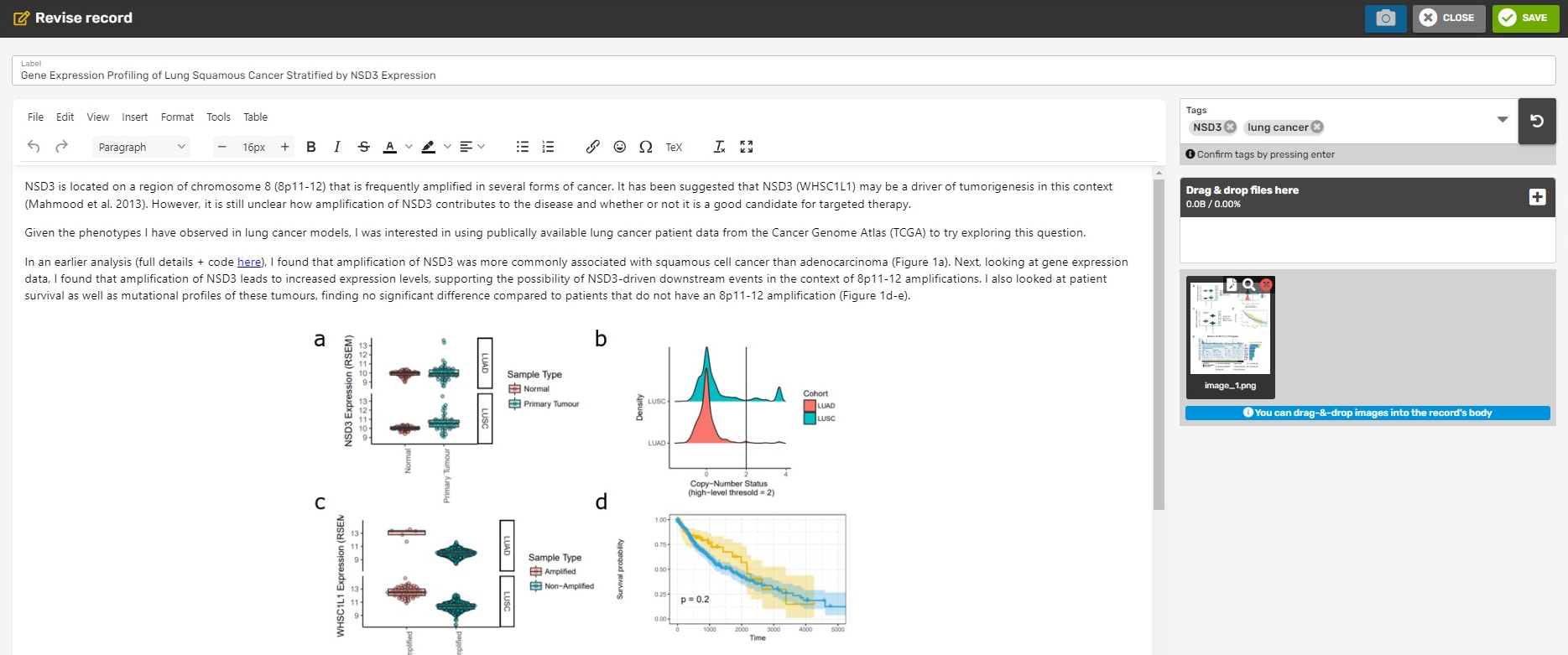 Notebook records consist of name (label), text body and/or file attachments. On top of that, each record has a timestamp showing when it was created, and information about which user created it. When a record is created, it can never be deleted - only new versions of the record can be created, or it can be hidden. All versions of a record are saved, including timestamps and user information. Records can be sorted into collections and freely moved between them.