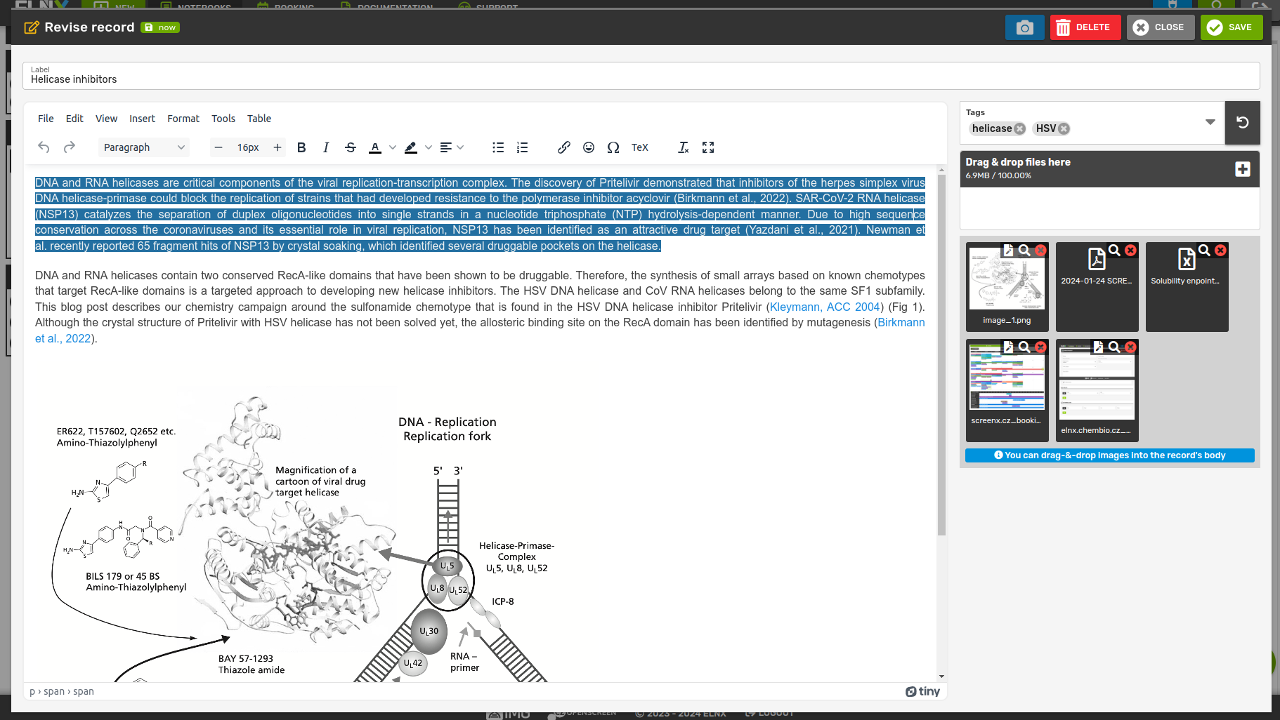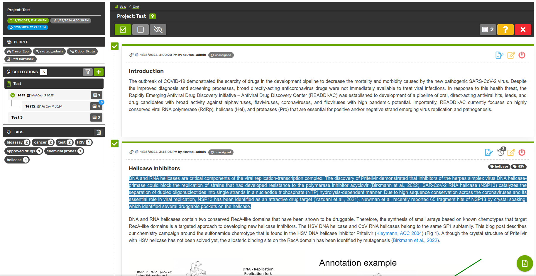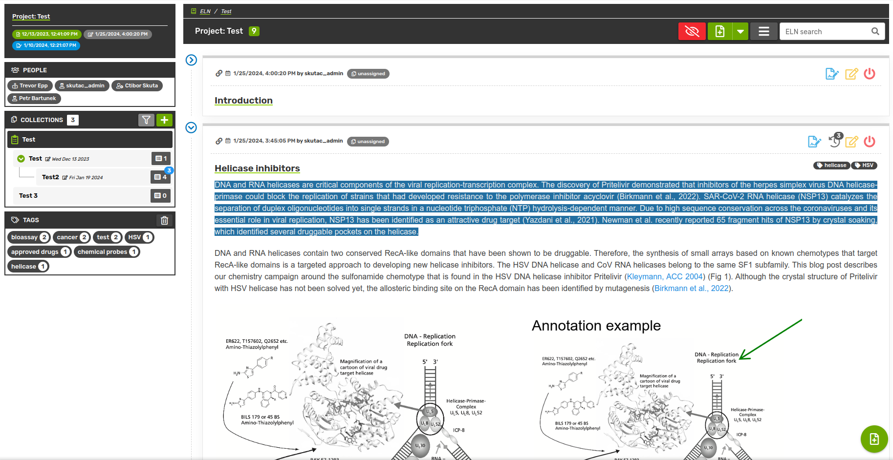 Notebook records consist of name (label), text body and/or file attachments. On top of that, each record has a timestamp showing when it was created, and information about which user created it. When a record is created, it can never be deleted - only new versions of the record can be created, or it can be hidden. All versions of a record are saved, including timestamps and user information. Records can be sorted into collections and freely moved between them.