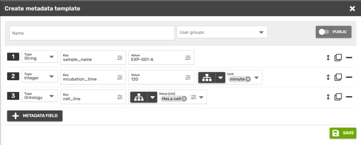 Metadata templates define the metadata properties of a record. They allow you to formally specify the fields that describe your data, in alignment with the FAIR data principles. To enhance semantic clarity and interoperability, each field can optionally be linked to an ontology. You can reference any ontology available through the Ontology Lookup Service.