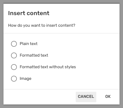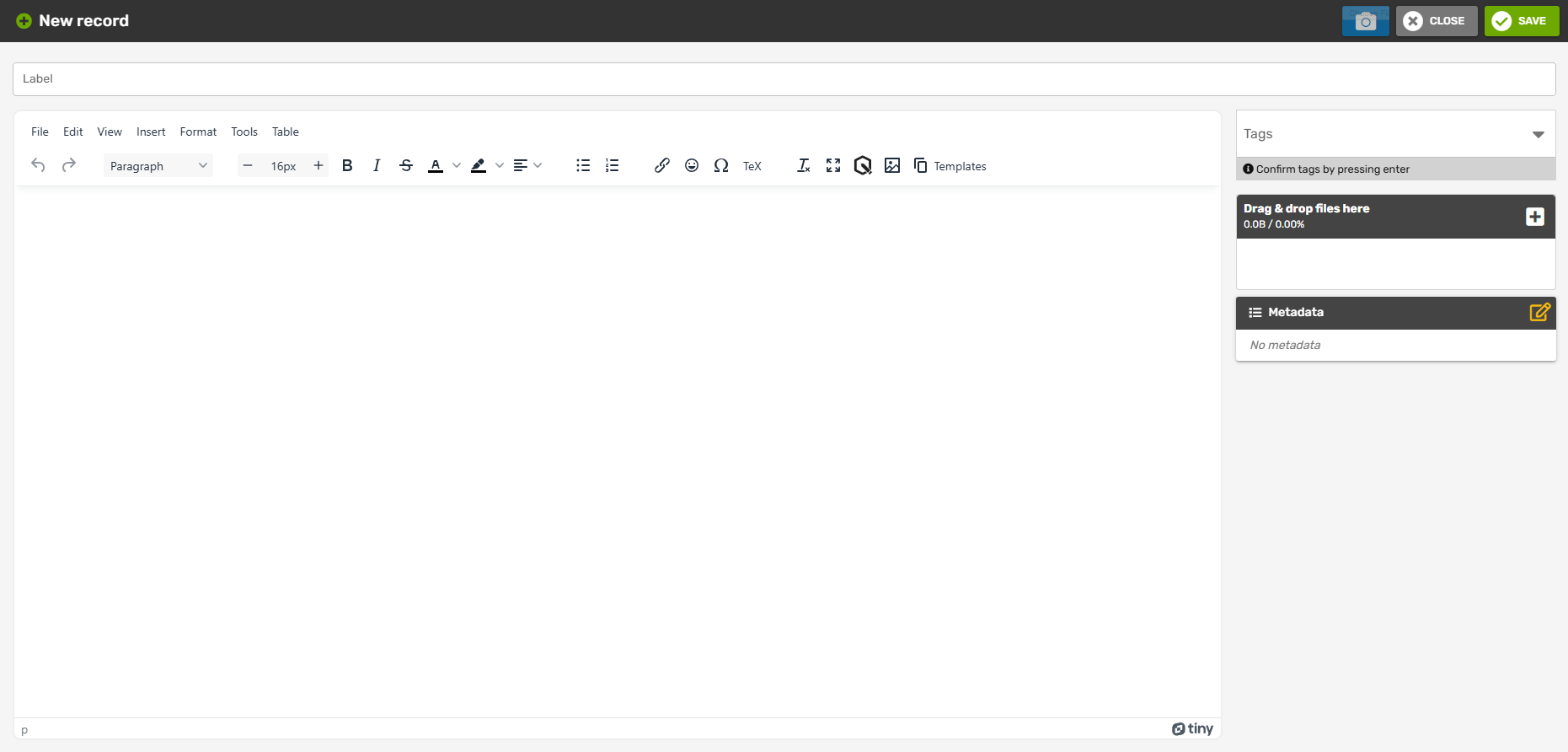 New notebook record can be created by clicking the Add record button in the navigation panel on top, or at the bottom-right corner of the page. This opens the New record form, which contains an input field for the label (the only mandatory field), a WYSIWYG editor for text/html, an input for attachments, and tags. On mobile devices, there is also a camera input which enables users to take photos that are directly attached to the record. While Label is a simple text field, in the main body (the WYSIWYG editor), you can either write or paste already pre-formatted text/html parts, images, tables, etc. When pasting from sources that support copying data both as html and image (e.g. from MS Excel), you can select how to paste the data. Just right-click on the pasted content, choose Paste as... and pick your preferred format. You can also drag-and-drop images into the record's body from the attachments section.