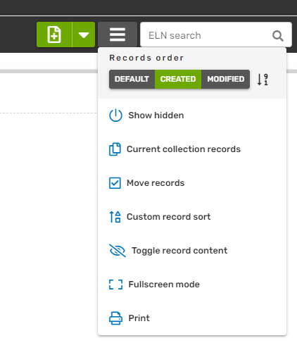 - Change the order of records in the collection. The options are Default (order defined by the user, using the Custom record sort), Created (order by date of creation), and Modified (order by date of last modification). The last button switches between descending and ascending order.