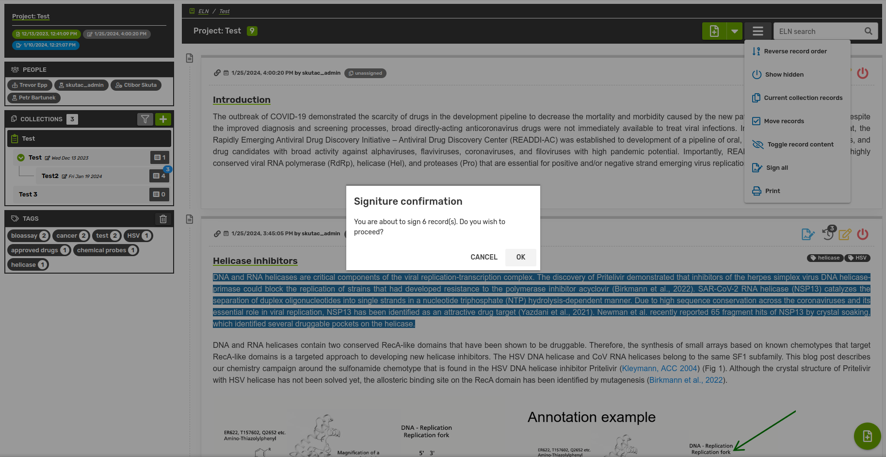 Records can be signed by project supervisors, by clicking the Sign record button in the top right corner of each record. This will apply a log with the name of the signee and a time stamp to the record. Alternatively, all records in a collection can be signed at once by selecting Sign all in the records menu (see below for more information).