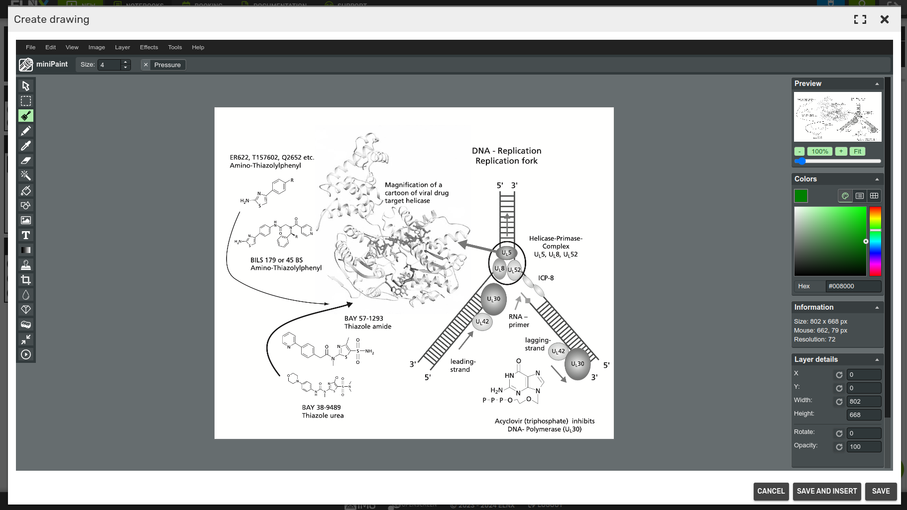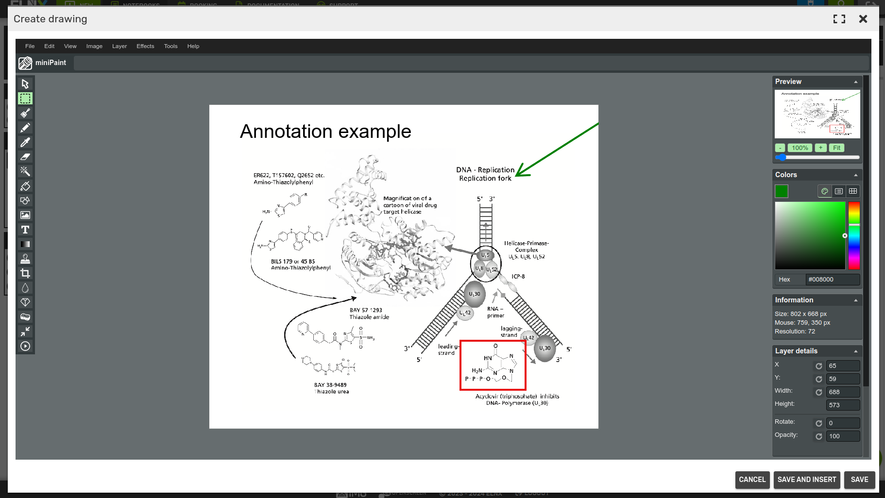 In case you want to edit the image before inserting it, click the Edit image button on top of the image thumbnail in the attachments section. The image opens in the Minipaint app where you can edit and annotate it.