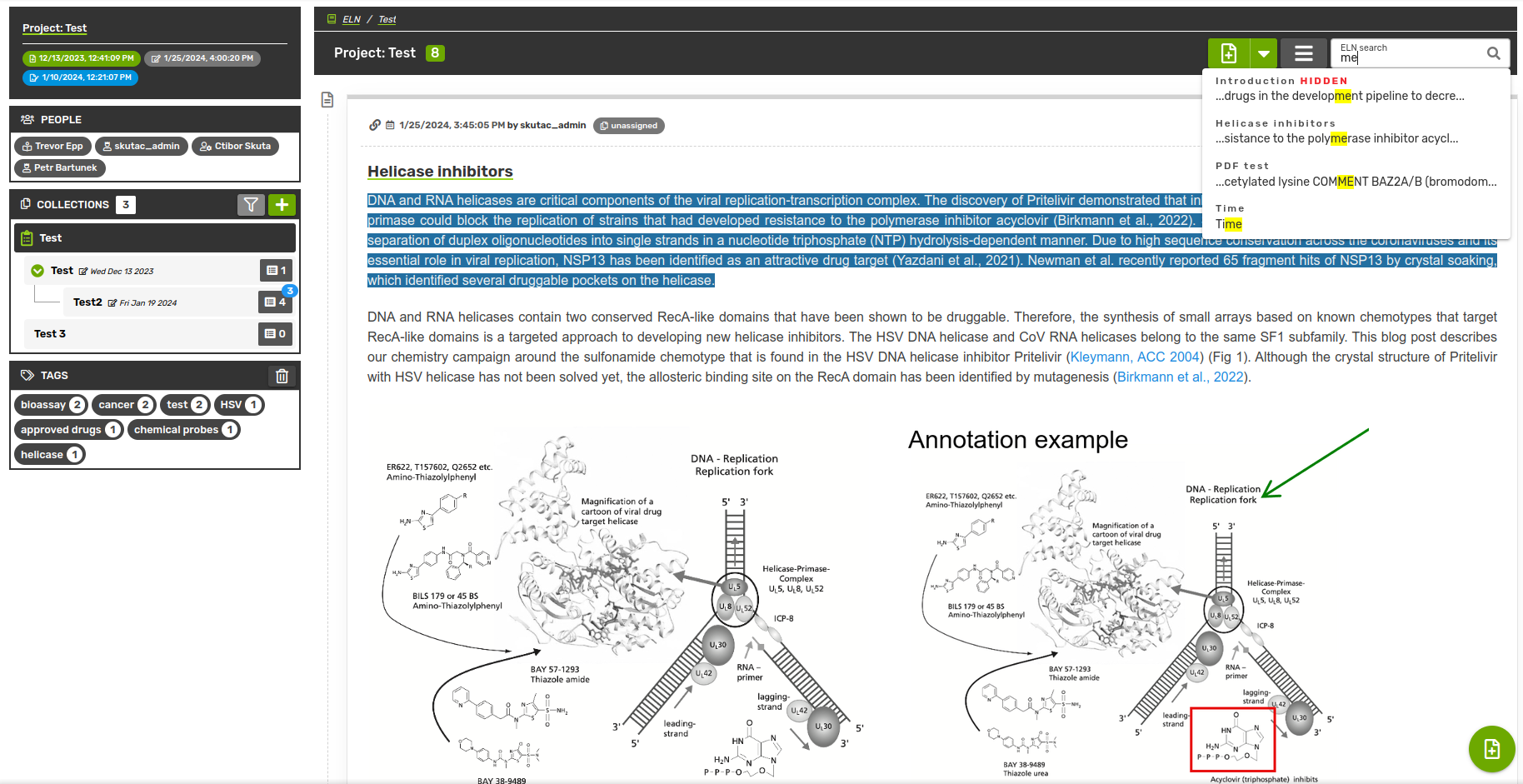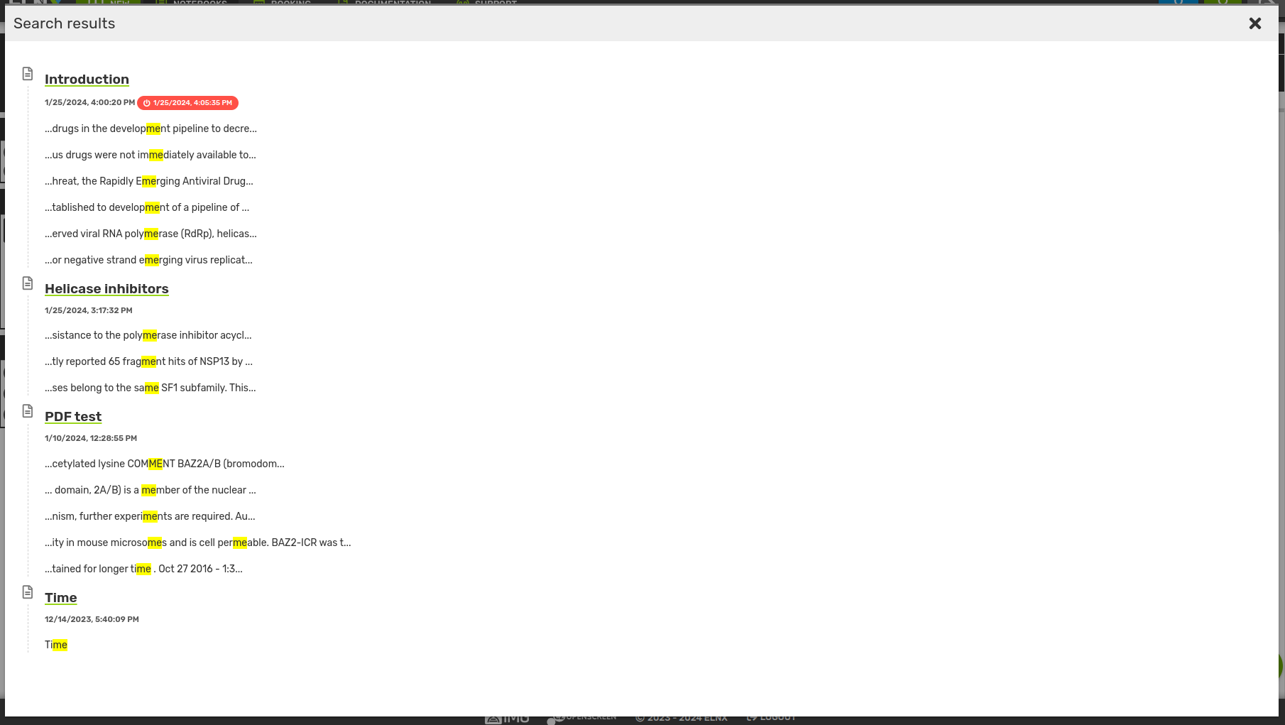 To search for a specific record or its version, you can use the search input in the top navigation bar of the notebook. Currently, the search is performed only in the text content of the records (label and body), the file attachments and their names are not included. You can search for a single or multiple sub-/strings at a time. To search for multiple terms or their substrings, just add a space between them (e.g., to find a record containing words chemical and kinase, you can use the query "chemical kinase" or even substrings "kin chem" - of course, the second query is more general).