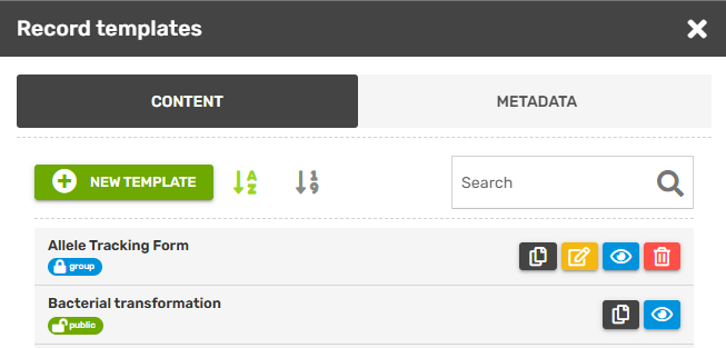 To view and manage your templates, click Manage record templates (paper file button) next to New project in the notebook navigation panel, or click Templates in the WYSIWIG editor toolbar when creating a new record. This opens the templates menu, where you can switch between template types, and view and edit your templates. To create a new template, click New template at the top, or pick an existing template and click Clone template.