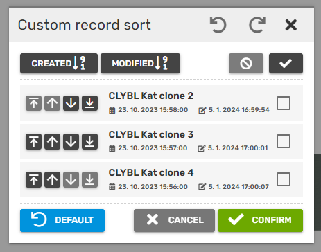 - Using this function, you can create custom order of records within the collections. Open the window through the actions menu or by clicking the collection in the collection tree with the right mouse button. You can sort records based on the date when they were created or modified, in ascending or descending order. To move individual records, you can either drag and drop them or use the arrow buttons. You can also undo/redo the steps or reset the order to default. All users will be able to see these changes.